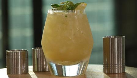 Strain the cocktail into a tumbler filled with crushed ice, garnish with a lemon slice and oregano leaves.