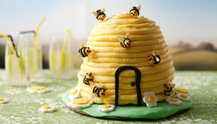 Transfer the remaining buttercream to a piping bag fitted with a plain 2cm/¾in nozzle. Pipe the icing around the outside of the cake in concentric circles to create a hive shape. On the top, pipe a spiral and smooth with a palette knife.