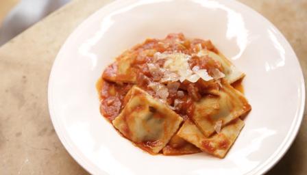 Serve the ravioli in serving bowls topped with the warm tomato sauce and a sprinkling of parmesan.