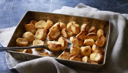 Tip the potatoes into a large baking tray and roast for 25 minutes. Mix them around, spray with more cooking oil spray and roast for a further 25 minutes, until golden-brown all over.