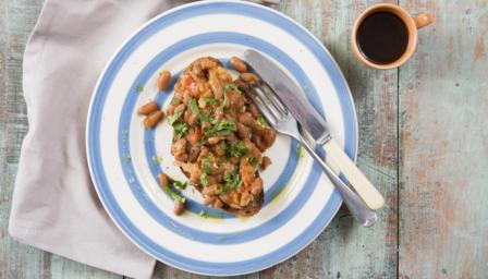 Fry the onions and garlic in a little oil until soft, add the tomato, beans and a dash of water and cook for 10 minutes until almost dry. Add ½ tsp smoked paprika and a drizzle more olive oil and season with salt and pepper.