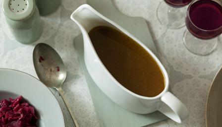 Reheat in the microwave for 4 minutes on high. Alternatively, if you have the time, add it to the roasting tray when the turkey is resting. Heat gently, and stir thoroughly to incorporate all the flavours from the turkey. Stir well and transfer to a serving jug.