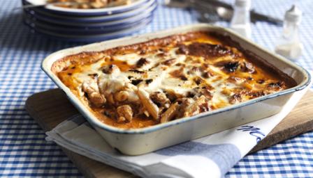 Meanwhile cook the penne in a pan of salted boiling water according to the packet instructions. Once cooked, drain and pour into the pan with the sausage and tomato mixture. Mix well. Pour this into a medium-sized ovenproof baking dish. Pour over the white sauce and bake for 15-20 minutes, or until bubbling and golden.