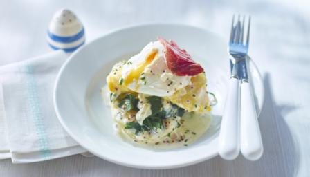 Place the spinach in the centre of the plates. Spoon the potatoes around the spinach and place the haddock on the spinach. Top with the poached egg and pour over the sauce. Garnish with Iberico ham.