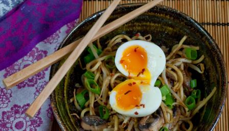 Season the noodles to taste and serve in a shallow bowl. Top with the egg halved and a sprinkling of chilli flakes.